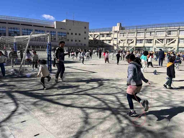 休み時間は、体力づくりのため校庭で短縄跳びをしています。気温が低く寒かったのですが、たくさんの子どもたちが元気に縄跳びをしています。曲に合わせて跳ぶ「リズム縄跳び」も楽しそうです。「めざせ!なわとびマスター!」を合言葉にがんばっています。