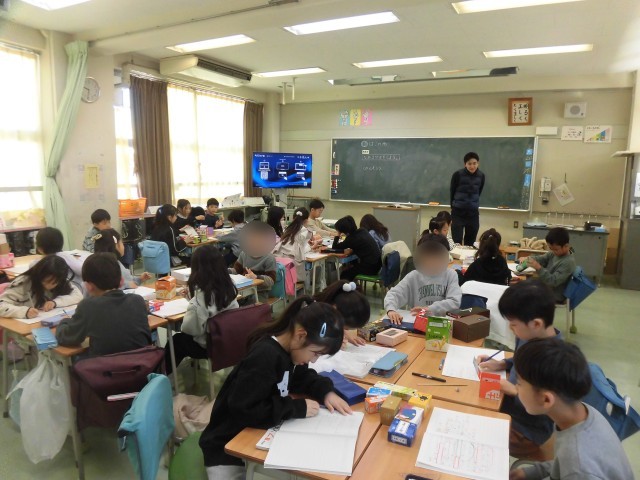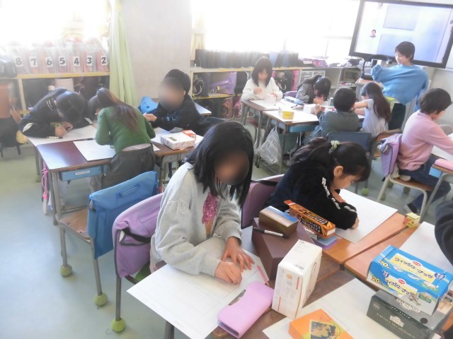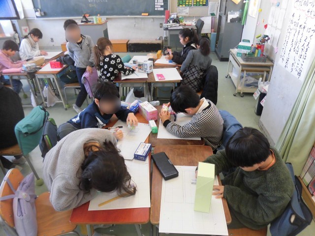 2年生の算数では「はこの形」の学習をしています。家から持ち寄った空き箱に、どのような特徴があるのが調べました。面の数や形、頂点の数、辺の数などに注目して考えました。画用紙にすべての面の型をとって、面の形を確認しました。また、箱の形を仲間分けして、特徴をとらえる学習にも取り組みました。