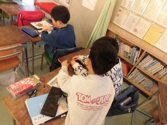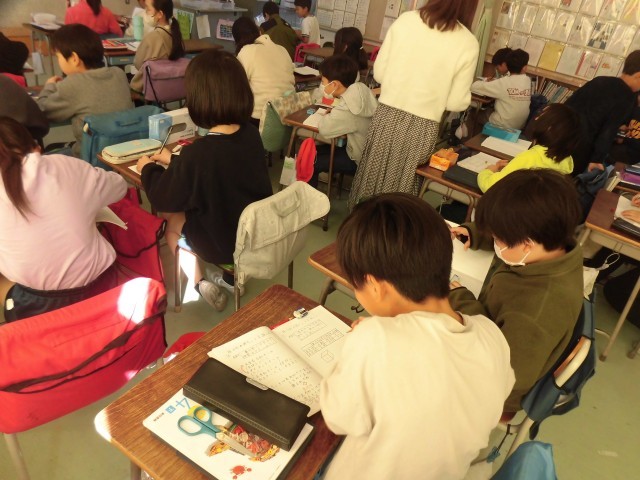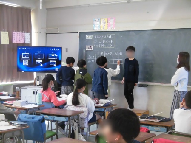 4年生の算数では「直方体と立方体」の学習をしています。今日は、サイコロや筆箱などを使って、直方体と立方体の面の数、辺の数、頂点の数を調べて表にしました。調べた結果をもとに、その関係性を考えました。直方体と立方体の違いや特徴を理解することができました。