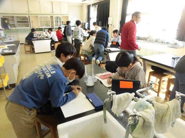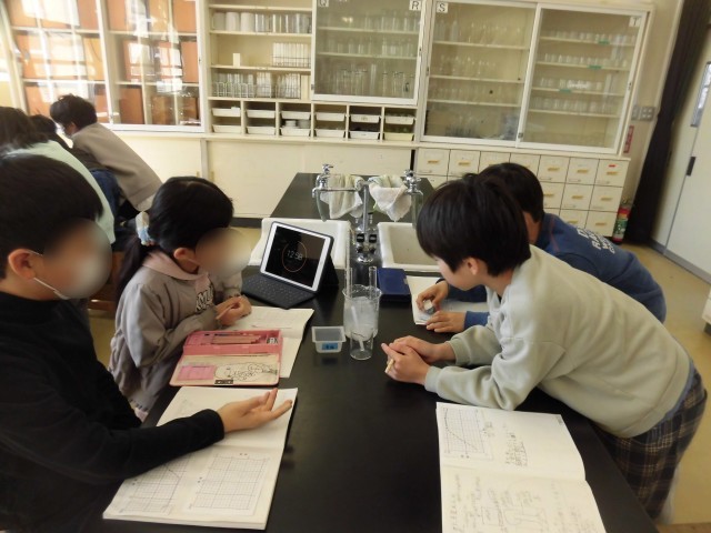 4年生の理科では「すがたを変える水」の学習をしています。今日は理科室で、水を冷やした時の変化について実験しました。ビーカーに水と氷を入れ、1分ことに温度を測定し、記録をとりました。水を冷やすために氷と食塩と氷を使用し、水の温度を下げて氷に変化させる様子も観察しました。ぐんぐん温度がさがって、水が変化していく様子を真剣に観察しながら実験することができました。