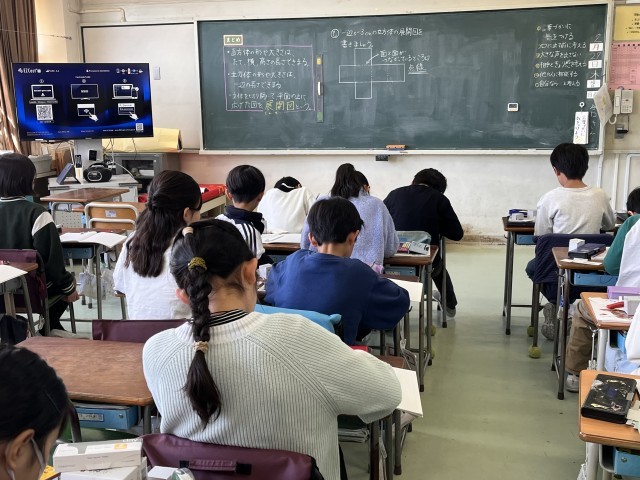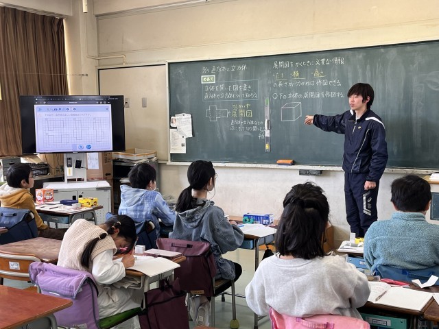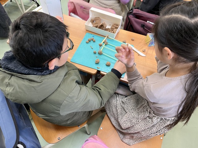 4年生は算数で「直方体と立方体」について学習しています。今は、立方体から展開図にを考えています。頭の中で開いていく様子を思い浮かべながら書いていきます。「面が五つしかなかった」「面が重なった」など、失敗もありますが、繰り返すことでイメージがしやすくなります。2年生も算数で「箱の形」を学習しています。ストローと粘土で直方体や立方体の頂点や辺をつくっています。2年生の学習が4年生につながっています。