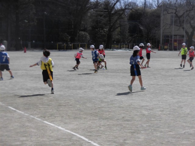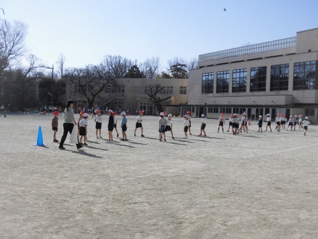 1年生の体育では「しっぽ取り」ゲームを楽しんでいます。体育着のズボンにしっぽの紐のはじを挟みいれて、しっぽを取られないように、友だちのしっぽを取れるように走り回ります。しっぽをすぐ取られないようにするためにどうしたらよいかコツを考えて、ドキドキワクワクしながら楽しむことができました。