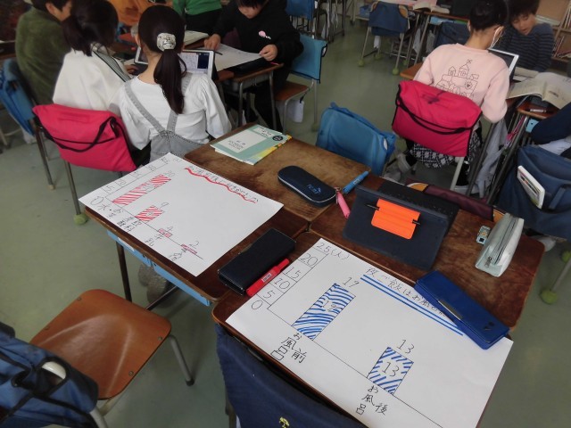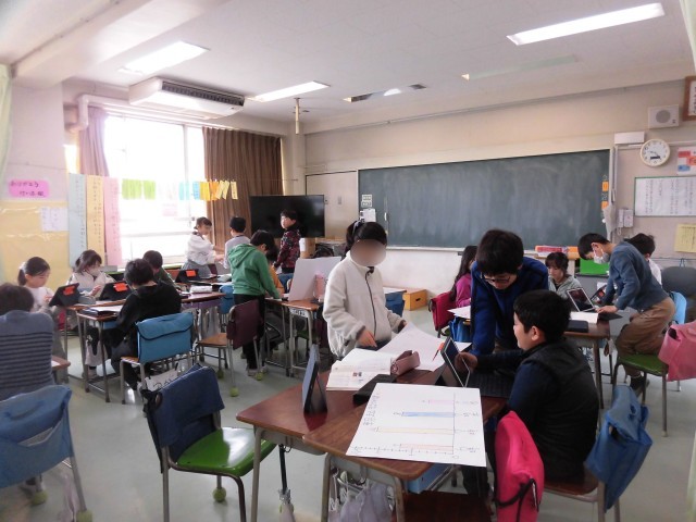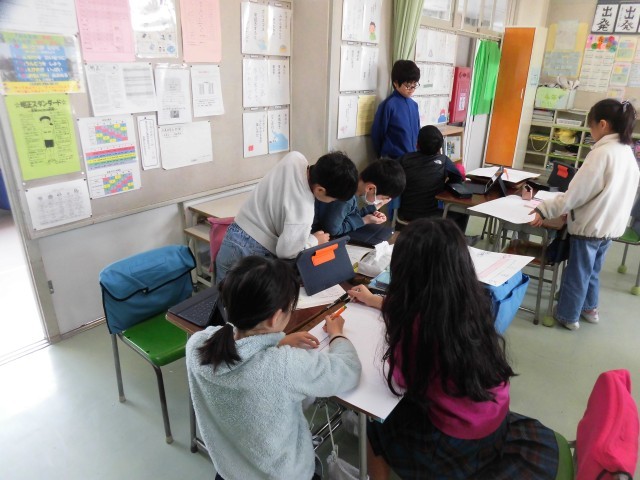 4年生の国語では「調べて話そう、生活調査隊」の学習をしています。普段の生活の中で「みんなはどうしているのかな」という疑問について調査して、クラスのみんなに発表する学習です。朝ごはんについて、習い事について、寝る時間についてなどなど、テーマごとにグループに分かれてアンケート調査を行いました。 今日はアンケート結果を整理して、棒グラフや円グラフにして、発表の準備を行いました。発表する内容や話す順番、グラフの作り方など、聞いているみんなにわかりやすいようにするための工夫をグループで話し合いながら準備を進めています。