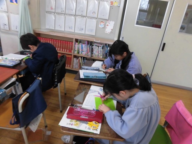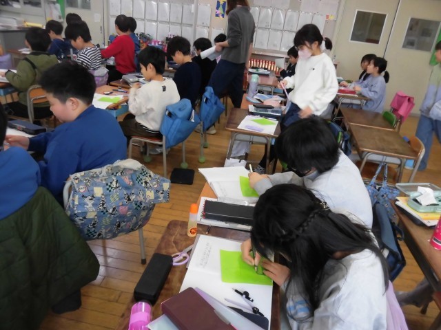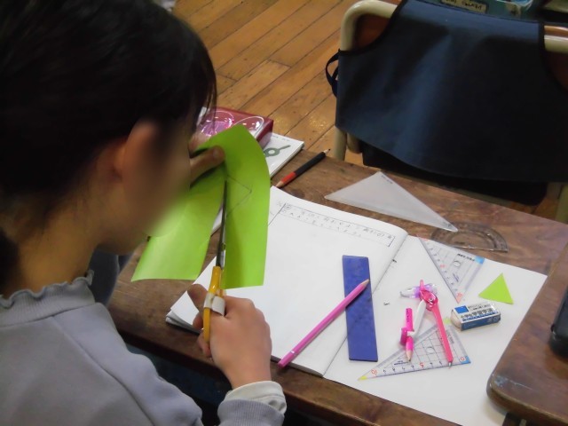 3年生の算数では二等辺三角形と正三角形の角の大きさについて学習しています。折り紙にコンパスを使って二等辺三角形と正三角形を書き、切り取りました。コンパスの使い方にも慣れて二等辺三角形や正三角形も上手に書くことができました。それぞれの三角形の角の大きさを比べ、その特徴について理解を深めました。