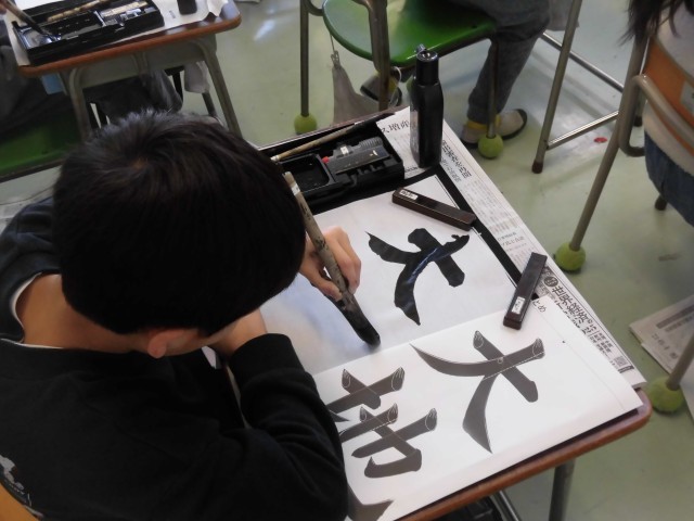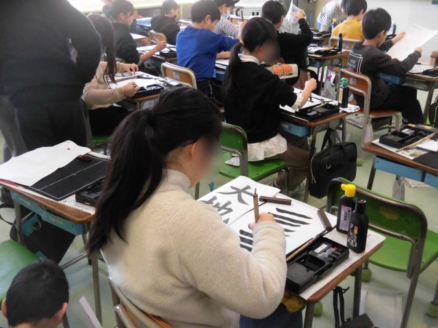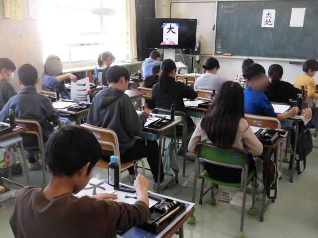 4年生の書写で「大地」という言葉を毛筆で書きました。4年生で学習した筆使い、字の形、字の組み立て、配列などを確かめながら練習しました。漢字二文字のバランスをとって、右はらい、左はらい、曲がり、はねの書き方を考えて、ゆっくりと丁寧に筆を動かすことができました。苦手な部分を繰り返し練習したり、お手本と向き合って、集中力が途切れることなく取り組むことができました。とてもしっかりした「大地」を書くことができました。