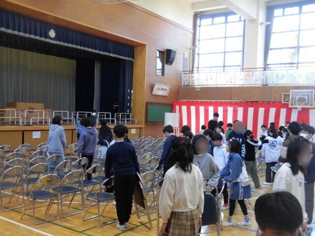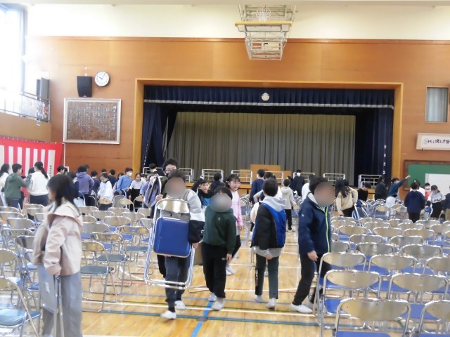 5年生が3月25日に行われる卒業式に向けて、体育館の会場設営をしました。保護者用と児童用の椅子をきれいに並べました。先生の指示のもと、協力して、声を掛け合って作業を進め、あっという間に椅子を並べ終えることができました。床も雑巾がけをしてピカピカになりました。5年生のチームワークの良さを感じました。4月から最高学年としての意識がますます高まっています。