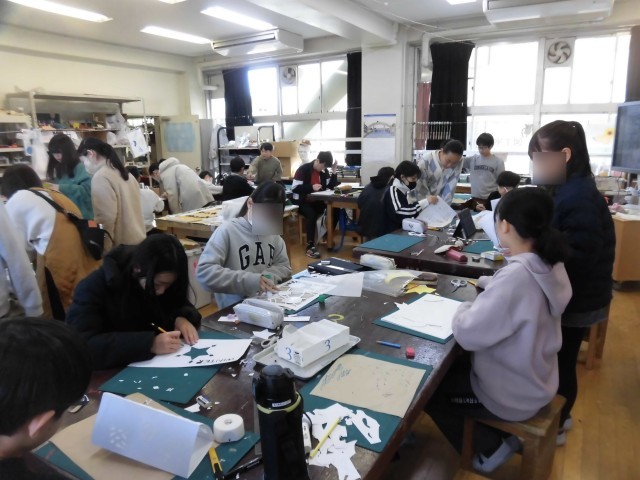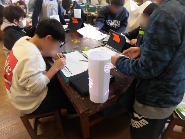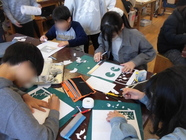 6年生の図工では「紙のランプシェード」の制作をしています。光の通り方を想像しながら、デザインを考え、上質紙に下書きをしました。下書きでは切るところをしっかりと考えながら書き、書き終えたら丁寧にカッターナイフで切っていきました。とても細かいデザインも少しずつゆっくりとカッターナイフを動かしてカットしている様子は、集中力が途切れることがありませんでした。出来上がったら、トレーシングペーパーをのりづけして、上質紙の両端をつないで丸や四角や三角に形作り、ライトアップしました。明かりをともすと、色鮮やかな世界が浮かび上がり、とてもきれいに仕上がりました。