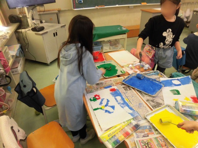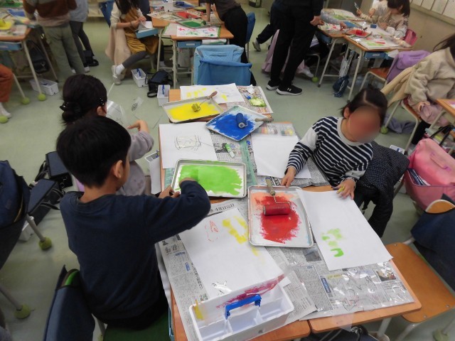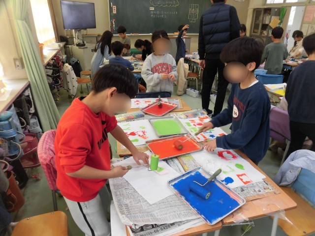 2年生の図工では「いっぱいうつして」の学習をしています。画用紙やクリアファイルを自分の好きな形に切って、型紙を作りました。ローラーを使ってインクをつけて画用紙にうつしました。模様を組み合わせてひとつの絵を完成させることができました。とてもカラフルですてきな作品が出来上がっています。