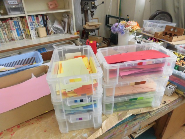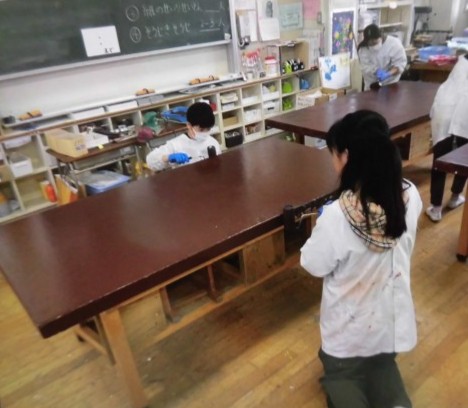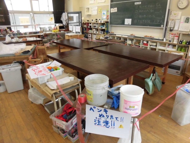 6年生が図工室をきれいに掃除してくれました。みんなでたくさん使ってきた図工室の机に茶色のペンキをきれいに塗り、まるで新品の机によみがえりました。使いかけの色画用紙もカットし、色別に仕分けするなど整理整頓しました。掃除機もしっかりと清掃もしました。役割分担をして、積極的にてきぱきと活動し、さすが6年生という姿を見ることができました。図工の時間を思い出しながら、感謝の気持ちも込めて、楽しく活動できたようです。