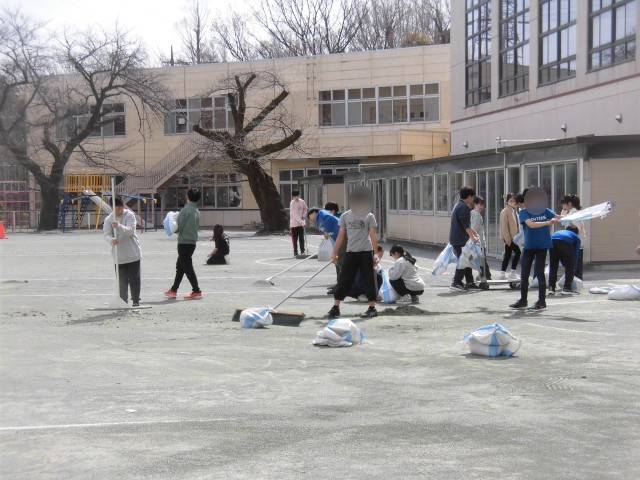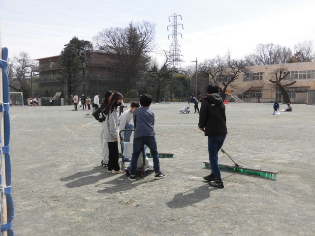 6年生が校庭の砂まきを行いました。新しい砂を校庭にまき、均一になるようにグラウンド整備用のコートブラシでならしました。みんなで協力して重い砂袋を運び、コートブラシもとても上手に扱い、あっという間にきれいに砂まきができました。校庭の安全を守るためにもとても大切な作業です。6年生、ありがとう!