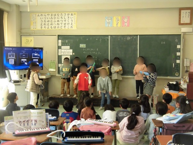 1年生の音楽で今まで練習してきた成果を発表する「おんがくかい」を開きました。グループで、鍵盤ハーモニカと打楽器とダンスと歌の担当に分かれて、「とんくるりんぱんくるりん」と「きらきらぼし」の曲を披露しました。担任の先生や音楽の先生も見に来てくれて、りっぱに発表できました。鍵盤ハーモニカもとても上手に弾けるようになりました。「ぜんぜん緊張しなかったよー!」「楽しかったー!」とニコニコ笑顔が見られました。