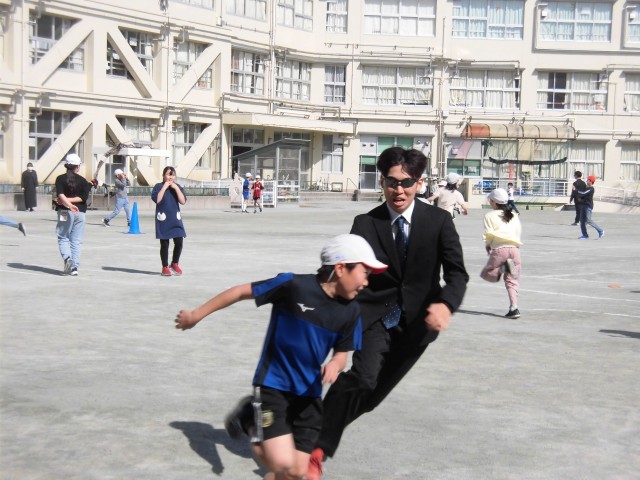 スーツを着た教員がサングラスをかけ、「ハンター」となってゲームに参加しました。