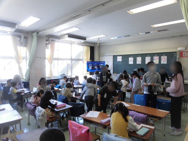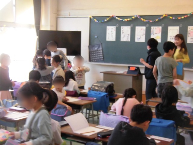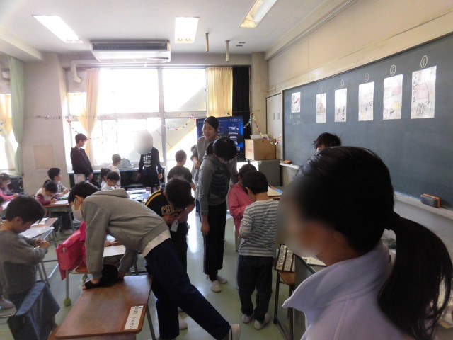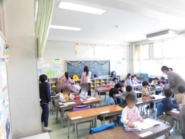 6年生が1年生の朝の支度のお手伝いが始まっています。登校してきた1年生に教室で名札をつけてあげたり、連絡帳や筆記用具を机にしまったり、帽子やランドセルをロッカーに置くなど、6年生がひとつひとつ教えてあげながら1年生と一緒に行います。ちょっと緊張した面持ちの1年生も、6年生たちの優しい声掛けにニッコリ笑みがこぼれています。