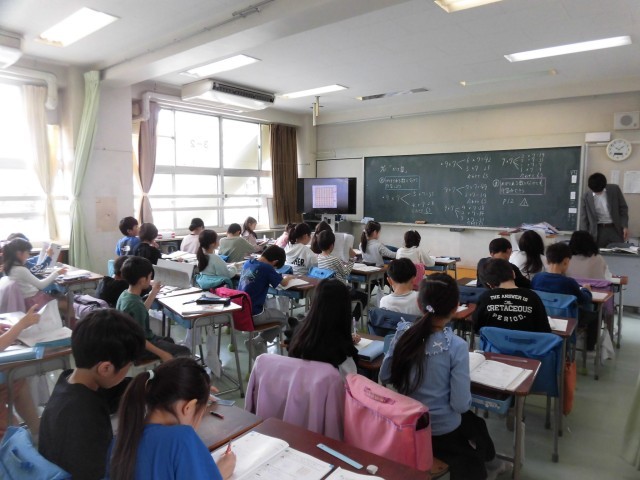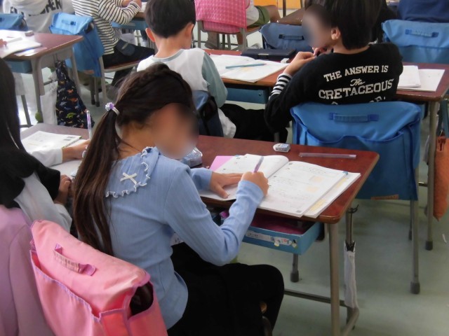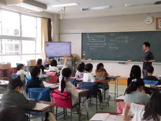 3年生の算数では「かけ算」の学習をしています。かけられる数を分けて計算すると答えはどうなるか、9×7を例にノートに書いて考えました。自分の考えをしっかりと発表し、友だちの考え方の発表をうなずきながら聞く様子が見られ、とても真剣に取り組むことができました。