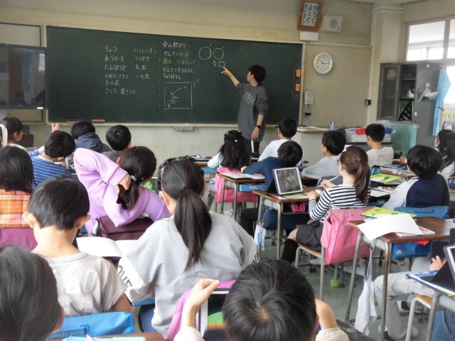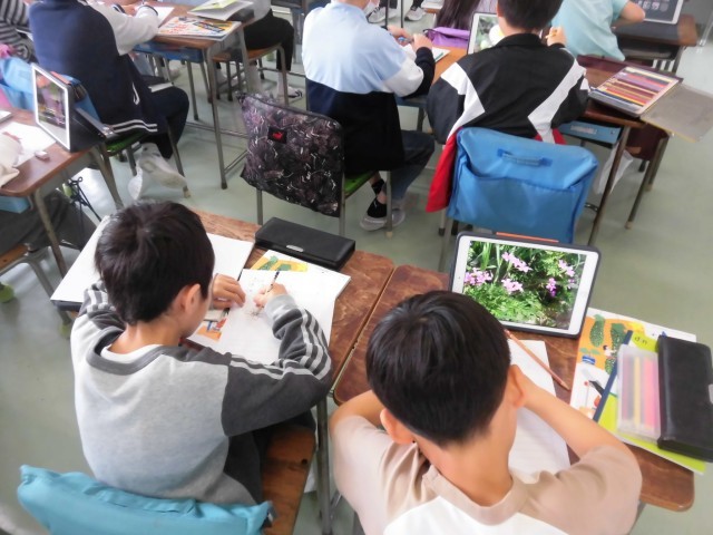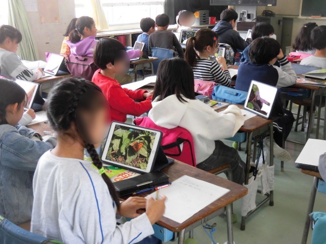 4年生の理科で「春のはじまり」の学習をしています。春のはじまりに見られる生物や植物などを見つけ、タブレットに記録をした写真を見て、観察カードを作りました。暖かくなり、蝶やたんぽぽなどの春の生き物にたくさん出会いました。観察カードの書き方の注意点を守って、観察するものをじっくりと見て絵をかき、文章で表しました。タブレットの写真を拡大して細かいところまでよ~く観察する様子もみられました。