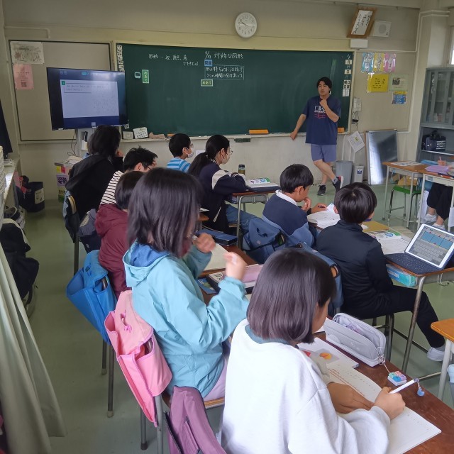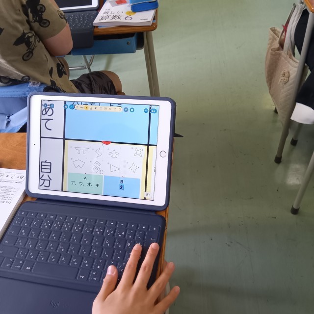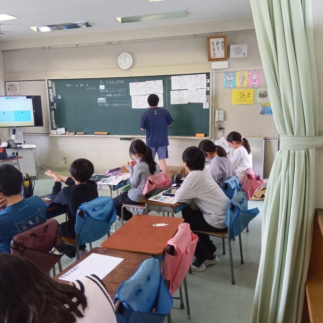 子どもたちは今日の問題をつかんで、めあてを考えます。複数ある図形を、図形の特徴に注目しながら2つの仲間に分けました。まずは自分でじっくりと考えた後、自然と友達と交流をする子どもたち。自らすすんで学習をしています。さすが、最高学年です。