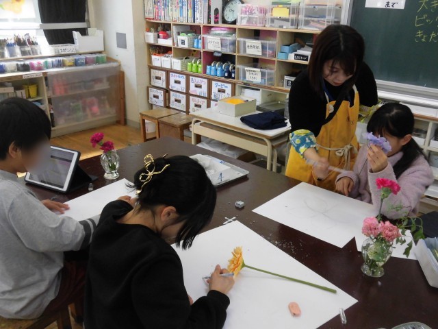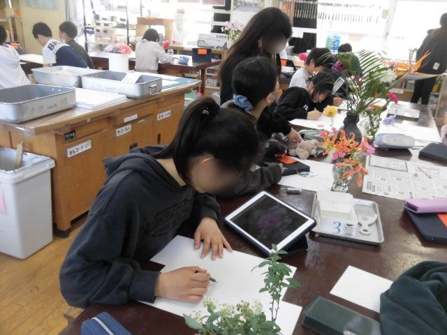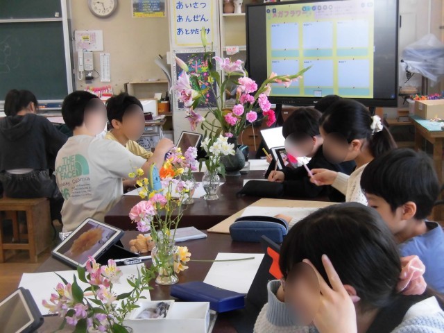 6年生の図工では「メガフラワー」の制作が始まりました。図工室に並んだたくさんの花から好きな花を選んで絵に表します。形や色をとらえて、画用紙の中にどのように描くか構成を考えて下書きをしました。タブレットも活用し、写真をとって細かいところまでじっくりと見てかく様子が見られました。花の香りなども感じながら、五感も使って制作をすすめました。下書きが終わったら、アクリル絵の具や水彩絵の具で色をつける予定です。