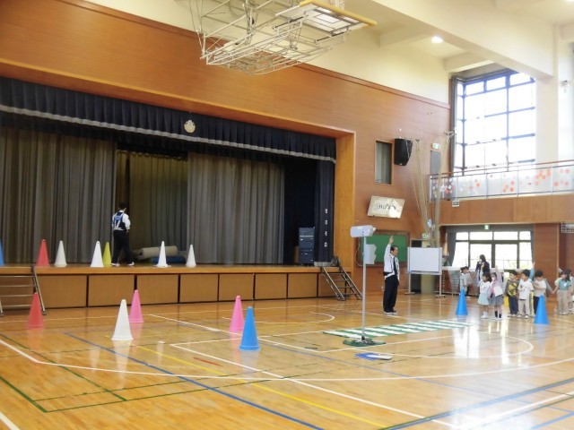 初めは体育館に作った歩道のコースを使って歩き方の説明を聞きました。入学して1週間ですが、静かにお話を聞けていて立派でした。