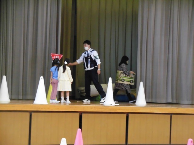 説明のあと、二人ずつ手をつないで実際に歩いてみます。少し緊張した様子が見られましたが、「右見て、左見て、まっすぐ手を挙げて。」と声を掛けていただくと、上手に渡ることができました。見通しの悪い場所では、車が突然走ってくることがあります。教員が車のまねをして実際の道路に近い場面を再現しました。警察官の方が注意するポイントを丁寧に教えてくださいました。