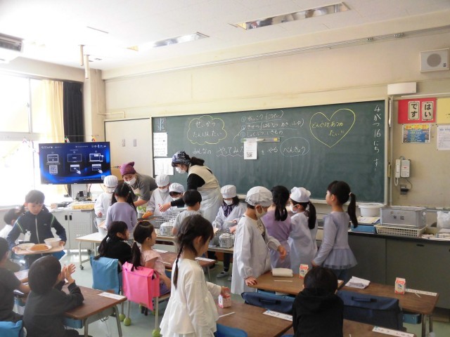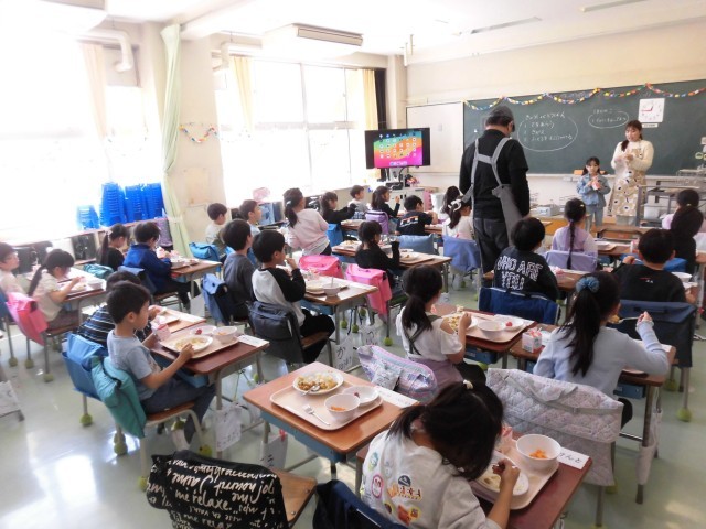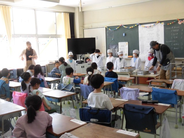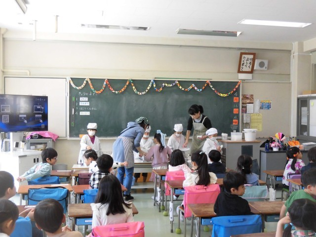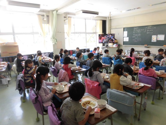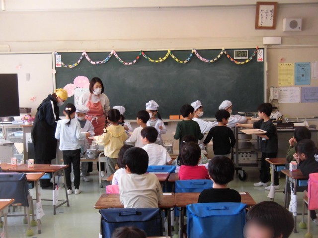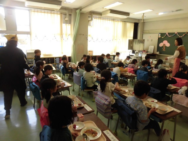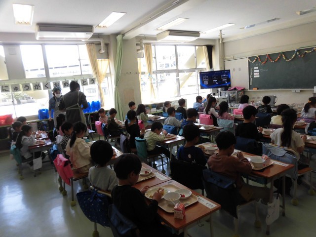 1年生は昨日から給食が始まりました。給食当番の子は白衣も上手に着て、落ち着いて上手に配膳ができました。昨日の1日目はカレーライス、2日目の今日はきなこ揚げパンで、大人気のメニューでした。みんなもりもり美味しくいただきました。みんなで食べる給食は格別のようです。「いただきます」「ごちそうさまでした」の大きな声が校内に響いていました。明日の給食も楽しみです!