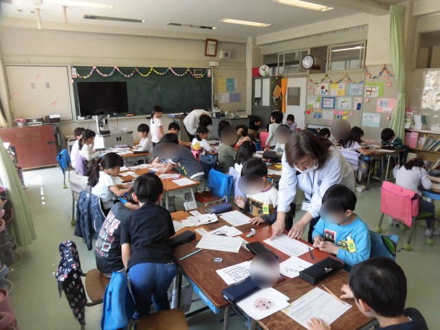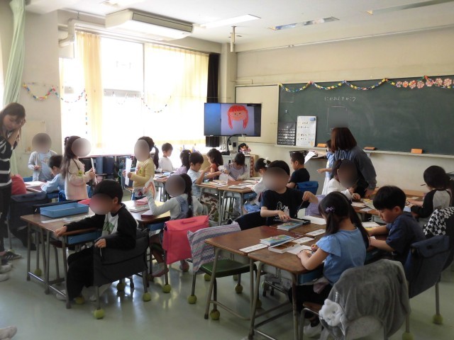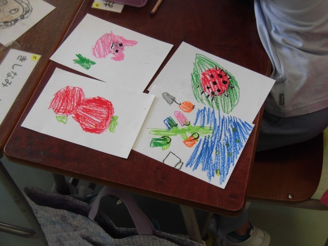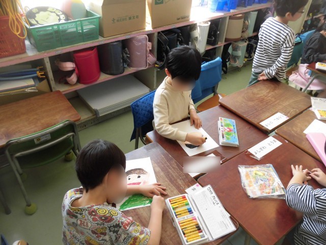 1年生の初めての図工の時間です。今日は「すきなものいっぱい」の作品の制作をしました。画用紙に、自分の好きなものをクレパスで絵に表しました。好きな食べ物や動物、お花、虫などなど好きなものを見つけては絵を描きました。集中してクレパスを動かし、一生懸命に描く様子が見られました。お友だち同士で好きなものの話をしながら楽しく作品を作ることができました。自分の似顔絵も描いて「見て!見て!」と嬉しそうに先生にお話していました。