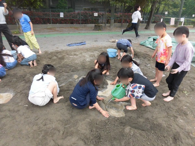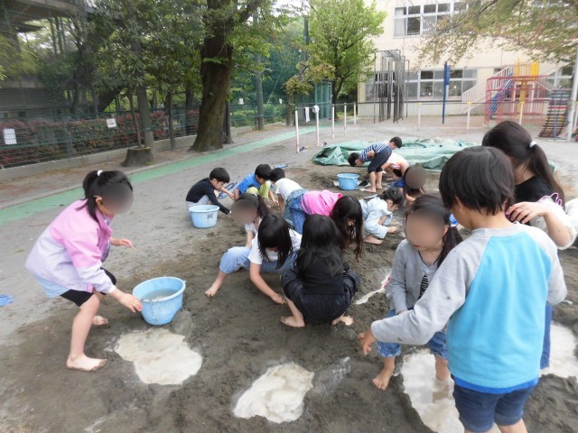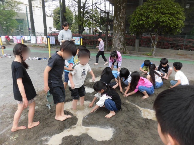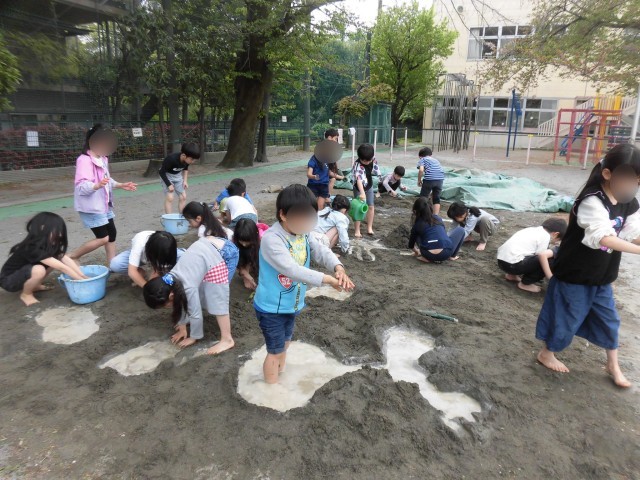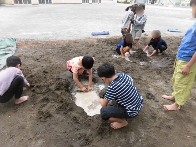 2年生が図工の「さらさらどろどろ」の学習で砂場あそびを行いました。素足になって、砂や泥の触り心地をめいっぱい楽しみました。スコップや手で大きな穴を掘って水を流し入れたり、山や川を作って水を流しました。素足に砂や泥の感触は気持ちよく、また、水がほどよく冷たくてとても気持ち良く、「気持ちいい~~」という声がたくさん聞こえてきました。水を汲む、穴を掘るなどの役割分担もしっかりと協力して活動できました。泥んこになって、とても楽しい学習となりました。