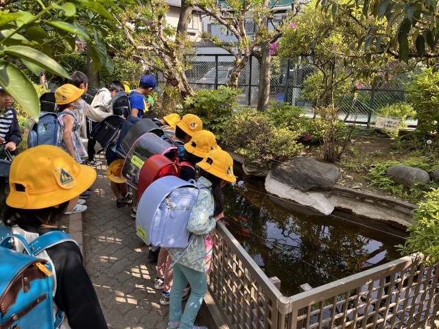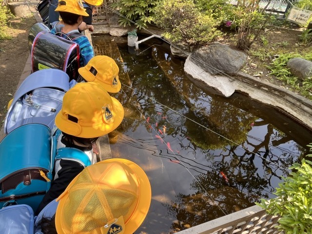 登校時間に、たくさんの子どもたちが正面玄関の池を眺めています。あたたかくなって、金魚たちが活発に泳ぐようになりました。子どもたちに聞いたところ、ヒレの長い「レアな金魚」がいるそうです。見つけられるでしょうか。