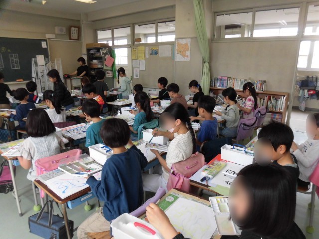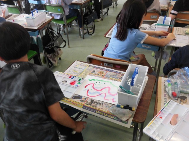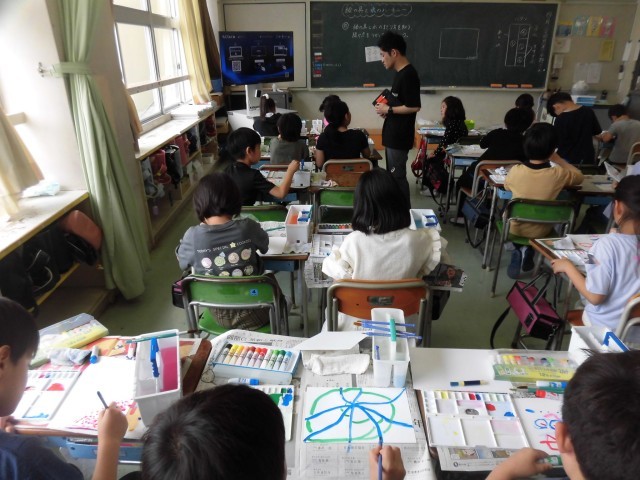 3年生の図工では「絵の具と水のハーモニー」の作品を制作しています。まず、絵の具と用具の基本的な使い方をしっかりと確認しました。好きな色の絵の具で自由に線や点を描き、絵の具を混ぜたり、線の太さを変えたり、水の量を変えたりして様々な線を描きました。絵筆の動かし方も工夫して、思いのままに様々な線を描くことができました。