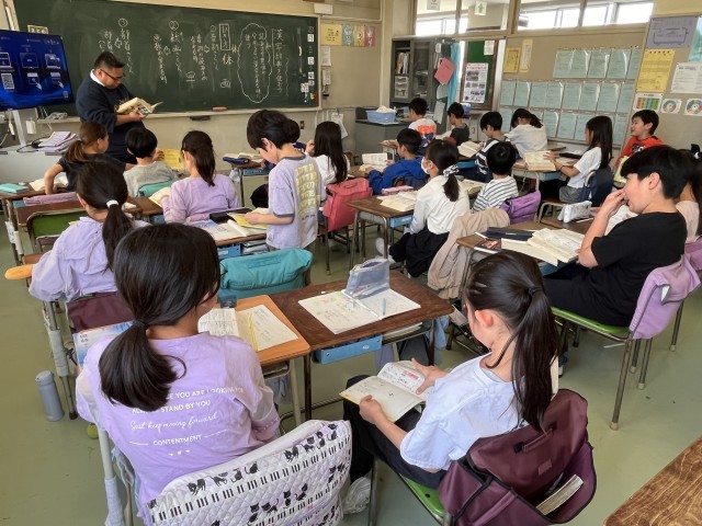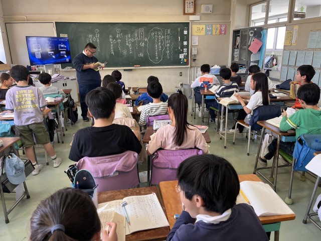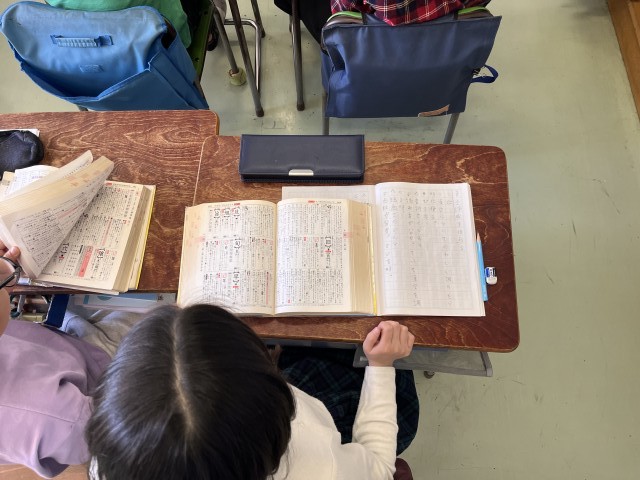 4年生は国語で漢字辞典を使って学習しています。漢字辞典は、音・訓読みから引いたり、総画数や部首から引いたりする方法があります。実際に漢字を調べて見るだけでなく、総画数の多い漢字や難しい読み方の漢字を見つけることもおもしろいようです。ノートにも丁寧に字が書かれていて感心しました。