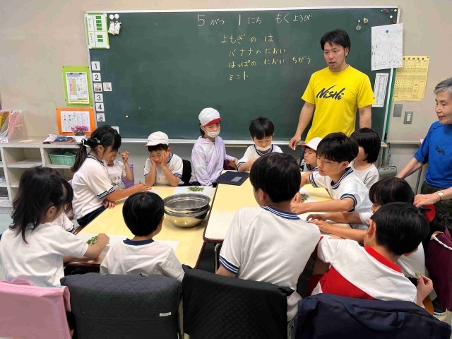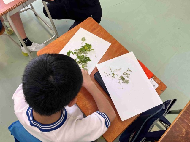 ひまわり学級では、ヨモギを摘んで、草もちをつくりました。摘んできた草もちのにおいをかいだり、手触りを確かめたりした後に、茎を丁寧に取り除きました。できあがった草もちもほんのりといいにおいがして、おいしかったです。