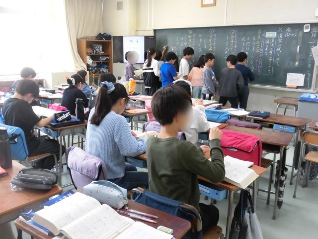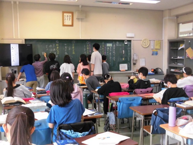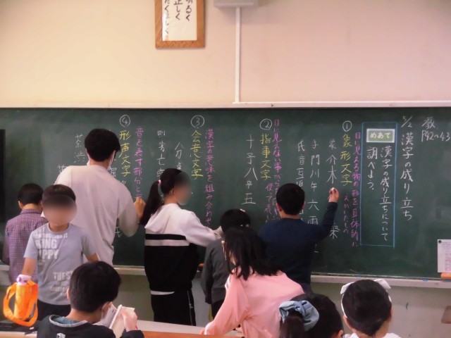5年生の国語では「漢字の成り立ち」について学習しています。漢字の成り立ちは、形を生かした「象形文字」、印や記号のように表した「指事文字」、漢字の意味を組み合わせた「会意文字」、音と意味を表す部分を組み合わせた「形声文字」の4つに分類できることを学びました。そして、漢字辞典を用いてそれぞれの成り立ちに分けて、該当する漢字を探しました。漢字辞典で次々と漢字を探して、黒板いっぱいに書くことができました。ゲーム感覚でとても楽しく学習することができました。これから、漢字の成り立ちを意識しながら、新しい漢字を学習するのも楽しいですね。