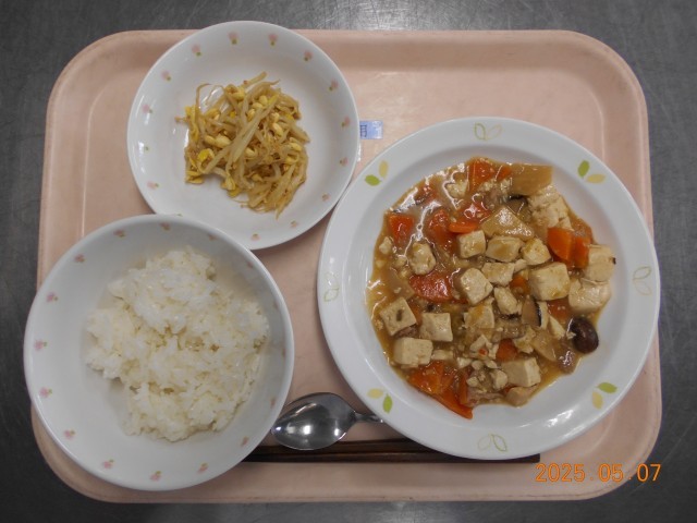 【献立】 牛乳 ごはん(有機米) 四川豆腐 豆もやしのごま風味
