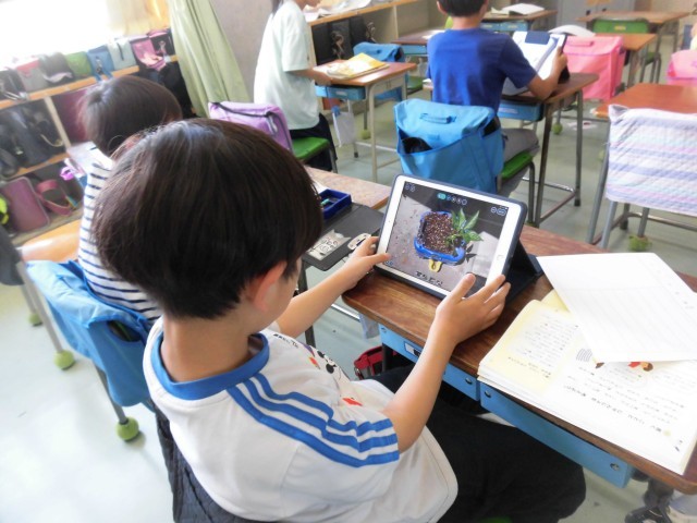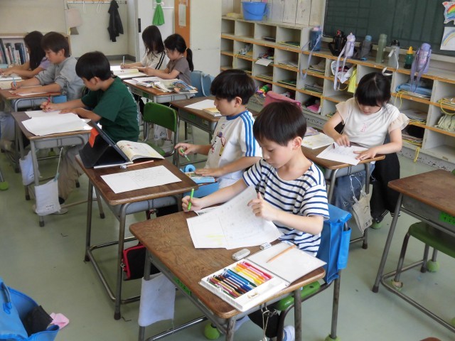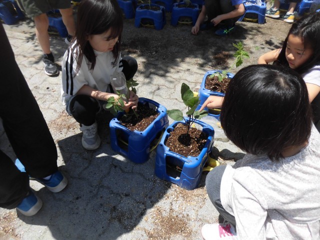 2年生が夏野菜の苗を植えました。ミニトマト、なす、ピーマン、おくらなど自分の好きな野菜を選びました。植えた後は初めての観察です。葉の形、色、手触り、においを詳しく調べました。中にはもう花のつぼみがついていたり、咲いているものもありました。教室に戻ると1枚目の観察日記を書きました。撮ってきた写真を見ながら、絵と文章で表します。書きながら、「花が咲いた後はどんなふうに実になるんだろう?」「このまま実ができて大きくなったら、地面についちゃうかも。」といろいろな疑問や感想が聞かれました。「水をたくさんあげて、元気になってほしいな。」「大好きなオクラを早く食べたいな。」大切に育てたいと思う気持ちが伝わってきました。
