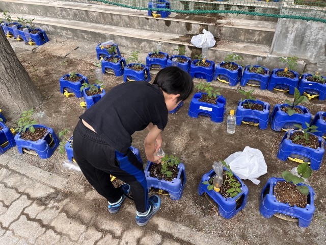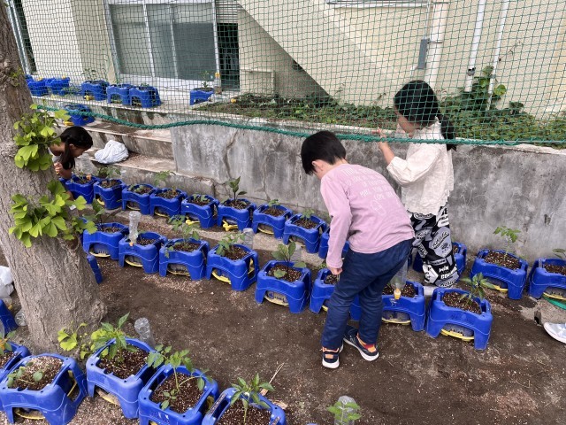 登校してきた2年生が植えたばかりの野菜の苗に水をあげています。「大きくなってね!」と声をかけていました。どのように大きくなって、実ができるのか、しっかり見てくださいね。1年生もかわいい芽の出たばかりのアサガオに水をあげています。