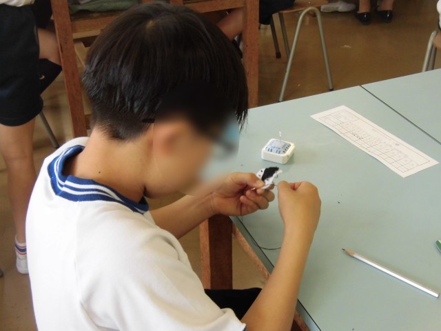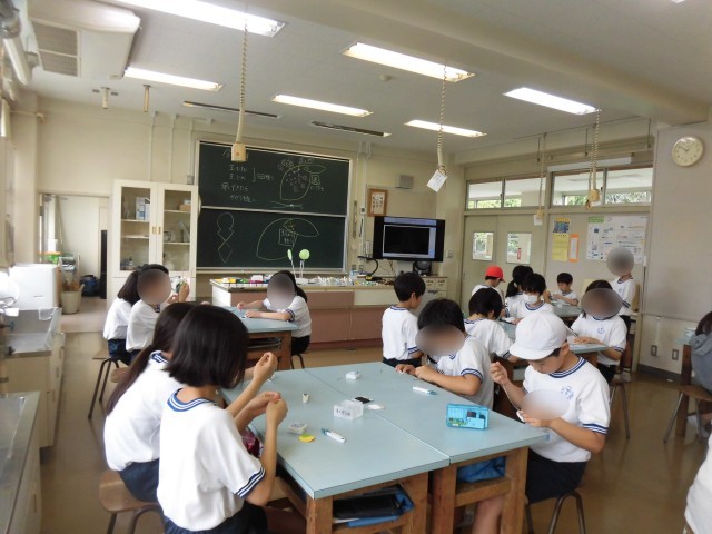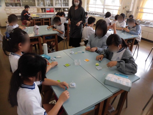 5年生の家庭科では裁縫の学習が始まり、手縫いの基本的な縫い方を練習しています。今日は、玉結びと玉どめの練習で、イチゴの形のフェルトにはつぶつぶを玉止めをたくさん作って表したり、おにぎりの形のフェルトにはごましおのごまをたくさんの玉どめで表しました。何度も練習すると徐々に慣れてきて、スムーズに玉どめを作ることができていました。「できた!おもしろいかもー!!」と裁縫にも興味がわいてきたようです。
