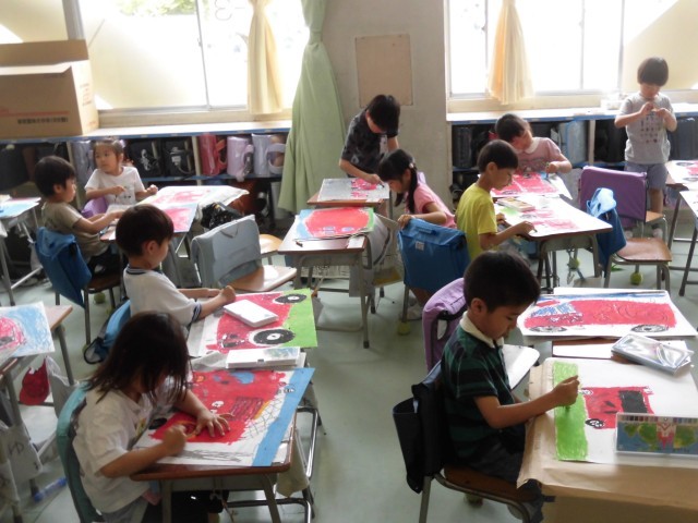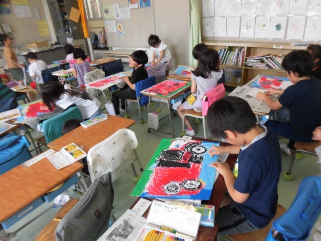 1年生が消防写生会で描いた絵の仕上げをしました。みんなの画用紙には、細かいところまでしっかりと観察した消防車が堂々と描かれていました。今日はまずその消防車がいちばん目立つ背景の色を考えます。次に画用紙の白いところが残らないようにしっかり色を塗ることを目指しました。大きな画用紙の余白を塗りつくすことは大変な作業です。クレヨンがあっという間に短くなって紙をめくって続けたり、中には折れてしまっても塗り続けたり、集中して取り組んでいました。途中でなくなると色の濃淡を変えるという工夫も見られました。「もっと塗れるよ。」「丁寧に塗っててすごいね!」教員も励ましの言葉をかけます。手をクレヨンだらけにしながら仕上げた作品は、どれも迫力のある絵になりました。