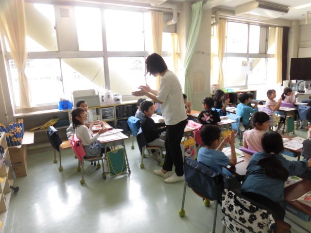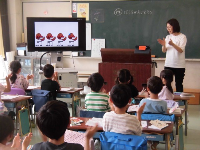 1年生の教室から、楽しそうな手拍子の音が聞こえてきました。覗いてみると音楽の授業で「拍を感じ取ろう」という単元の学習をしていました。たんたんたんとみんなで手拍子をしながら「〇〇さん。」と一人一人名前を呼んでいきます。自分の番が近づくとワクワクした表情をしたり、名前が呼ばれるとにこにこしたり、思わずこちらも笑顔になるような内容でした。次は動画に合わせてリズムをまねします。どんどん変化するリズムにはじめは「難しい!」「わからなくなちゃった。」と苦戦していましたが、くり返し練習するうちにそろうようになりました。周りを見てあわせることもいろいろな場面で大切なことです。みんなでそろった時の気持ち良さを感じてくれると嬉しいと思います。