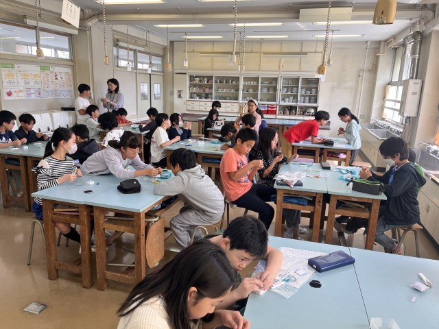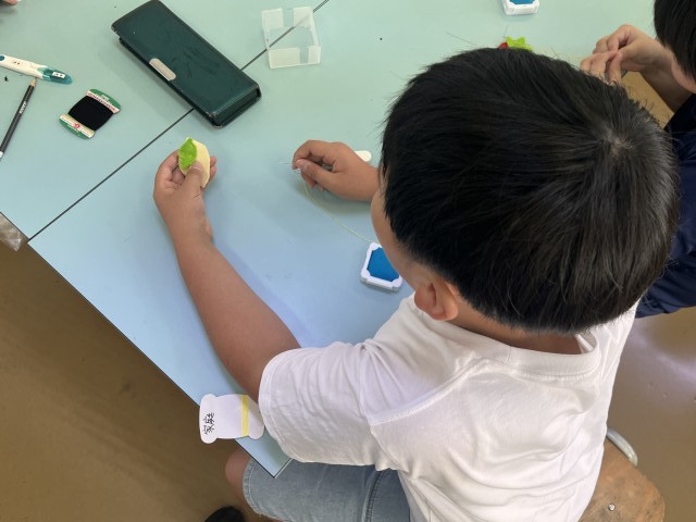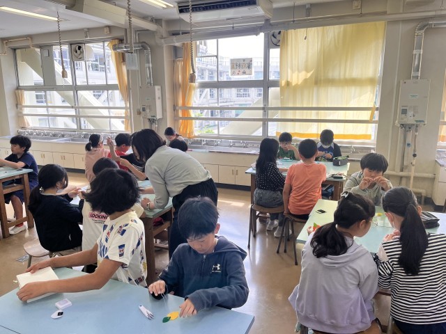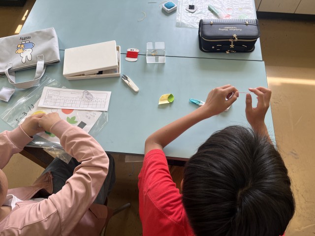 5年生が家庭科で、いろいろな縫い方や玉どめ、玉結びを学習しています。フェルトでおにぎりや果物を作っていました。「針に糸が通らない」「糸が短すぎて玉どめができない」という声も聞こえてきますが、楽しそうに取り組んでいます。学習発表会では、もっと上手になった様子が見られるそうです。楽しみです。