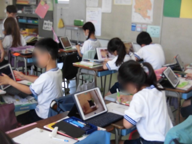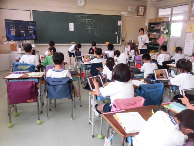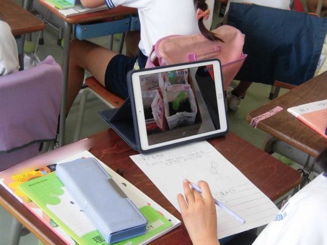 3年生の理科では「植物の育ち方」の学習をしています。先日植えたホウセンカの種から芽が出て子葉が開いています。今日はその子葉を観察しました。タブレットで写真を撮り、拡大して細かいところまで観察する様子も見られました。観察カードに子葉の絵を描き、形や色、葉の枚数など気づいたことをしっかりと記録しました。ホウセンカがこれからどのように成長するのか、観察を続け、植物の育ち方について学習を続けます。