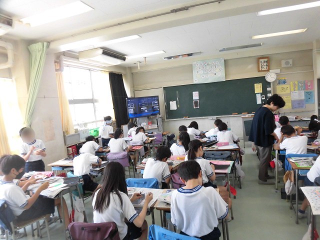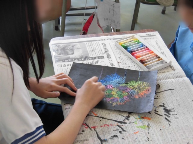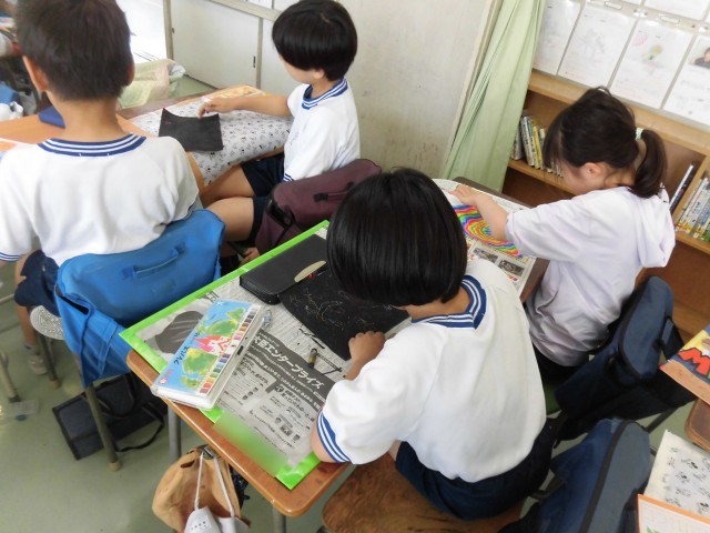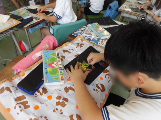 4年生の図工で、ひっかき絵(スクラッチ)の制作をしています。画用紙をいろんな色のクレヨンで塗ります。上から黒いクレヨンで塗りつぶします。爪楊枝でひっかいて絵を描きます。塗りつぶすのはとても根気がいる作業のようですが、みんな楽しんで取り組んでいました。爪楊枝でひっかいて花や動物や花火などを描いたり、偶然できた模様をひろげて素敵な作品に仕上げることができました。