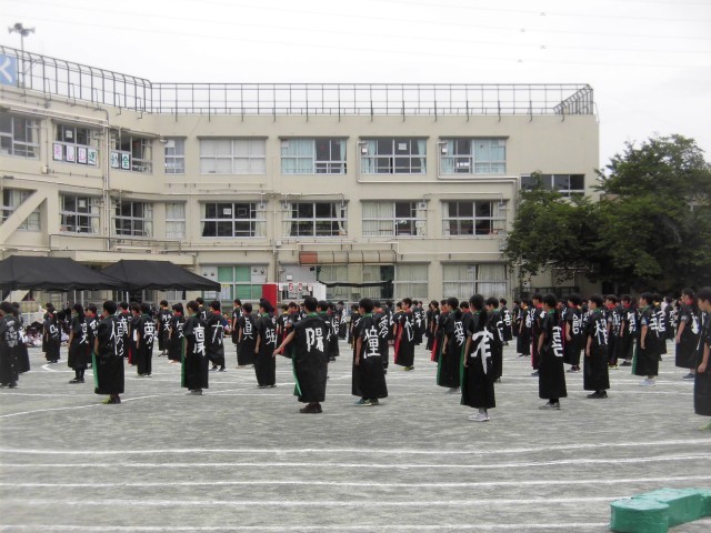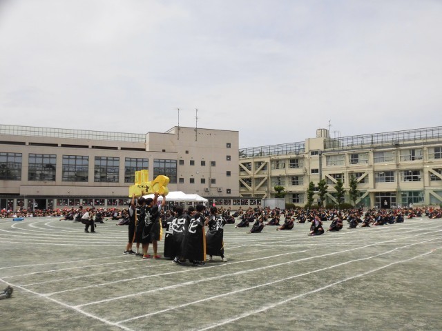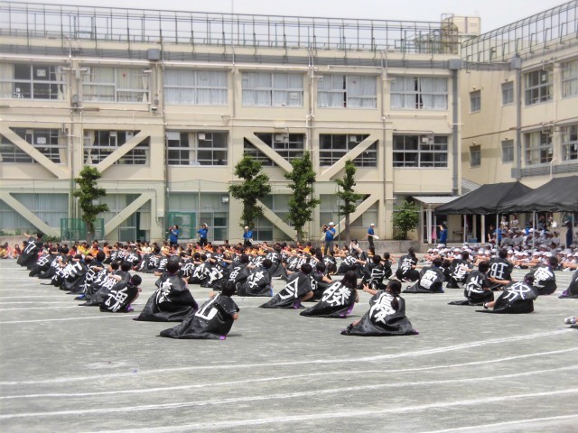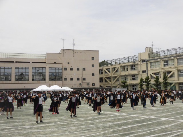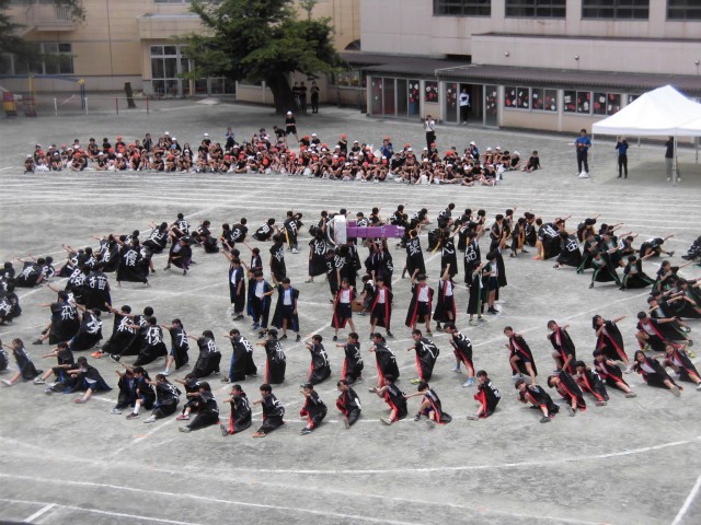 5年生のソーラン節です。今年のソーラン節は、ひとりひとりがキャストとして愛される高学年となるべく、カギを手に入れて成長してく姿を表現しながらソーラン節を舞いました。自分で背中に好きな文字を書いたはっぴ姿も格好よく、大きな掛け声も校庭に響いていました。見ている他学年の児童から「かっこいい!」「すごい!!」と声が聞こえてきました。後輩たちから「憧れの背中」を見せることができました。