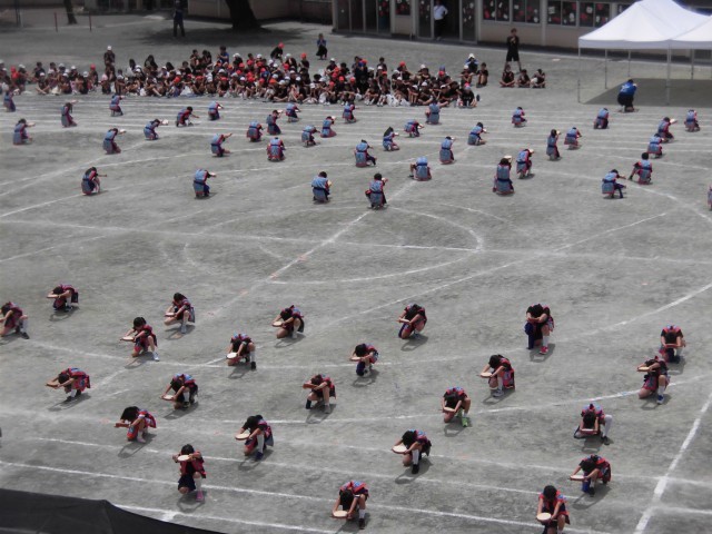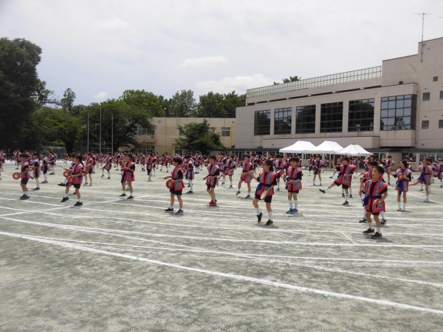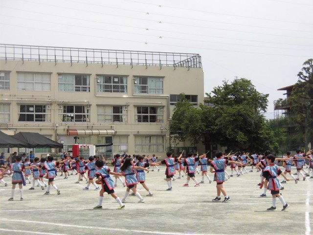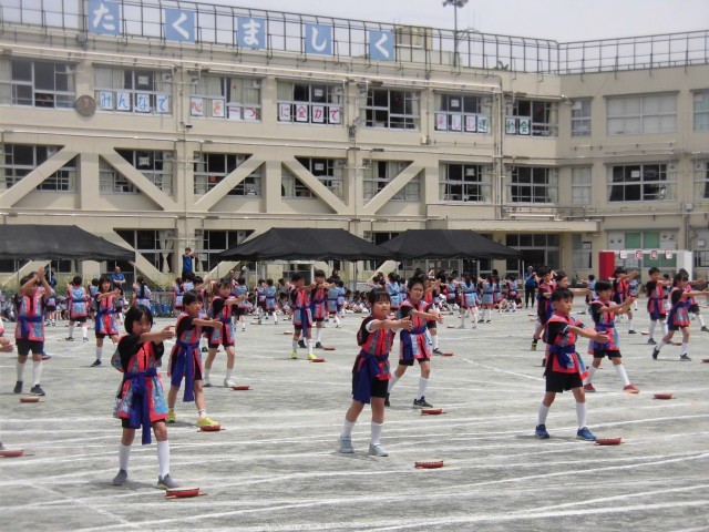 4年生は、明正小学校伝統の「エイサー」を踊りました。エイサーは沖縄の伝統芸能のひとつです。エイサーの太鼓のパーランクーの音がそろい、校庭に響きました。元気な掛け声に合わせて、動きもぴったりあった踊りを披露してくれました。難しい振り付けもしっかりと覚え、堂々と元気な踊りを披露してくれました。