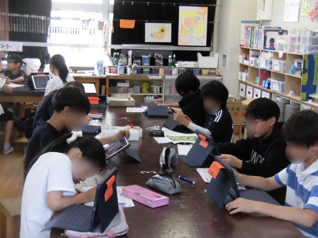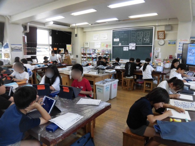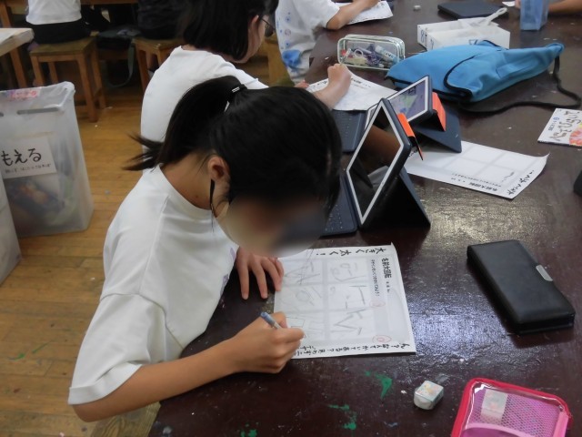 5年生の図工では、版画の「名前大回転」の作品を制作しています。自分の名前をどのようにデザインするか考えて版の図案を何種類も考えました。ひらめいたデザインを先生にアドバイスをもらいながら、次々とワークシートに描いていました。どのデザインで作品を作るか悩む様子も見られました。デザインを決めたら、カーボン紙を使って板に下書きをして、彫り進めていきます。名前どこに隠れているのか…、すてきな作品の出来上がりが楽しみです。