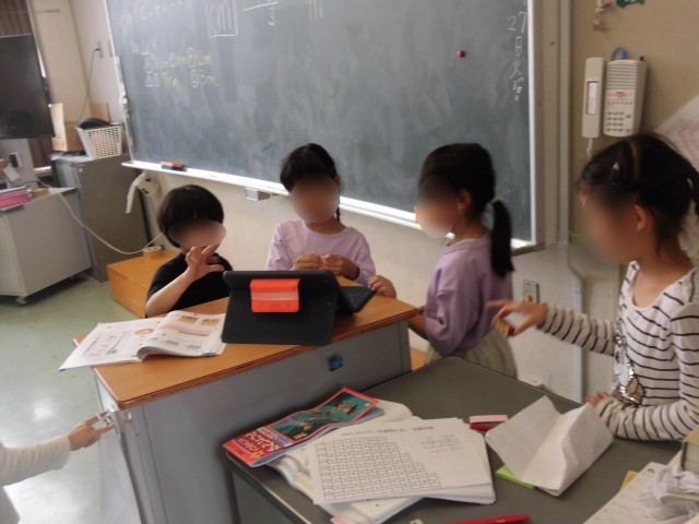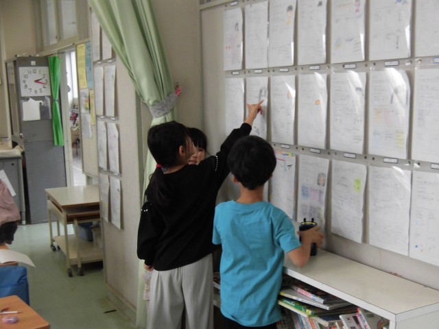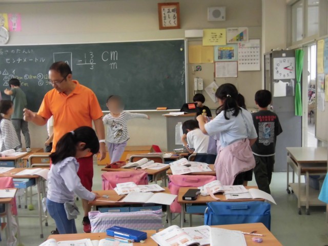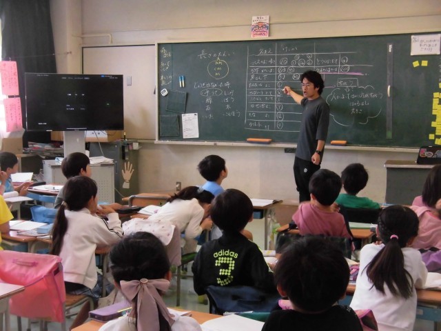 2年生の算数では「長さの単位」について学習しています。長さを表す単位「センチメートル(cm)」「ミリメートル(mm)」などの読み方や書き方を学習して、ものさしの目盛りの読み方も練習しました。そして、自分の親指と人差し指を広げた長さで10cmをはかり、身のまわりの10cmのものを探しました。10cmがどれくらいになるのか、身をもって学習することができました。人間の体の一部を基準にして長さを表すことが一般的だった時代のことも知り、単位の必要性も気づくことができました。