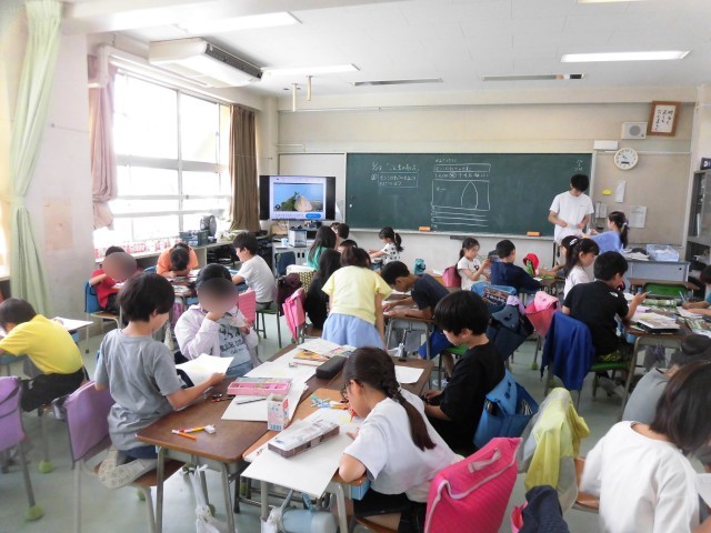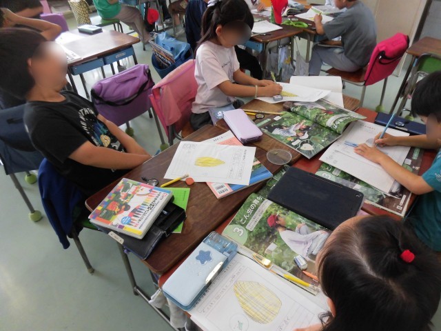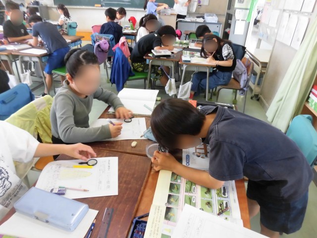 3年生の理科で「昆虫の育ち方」について学習しています。今日は、校庭で見つけたモンシロチョウのたまごの観察をしました。小さい小さいモンシロチョウのたまごをルーペを使って観察しました。拡大したたまごの様子を細かいところまで観察して、観察カードに描きました。形や色の特徴もしっかりと記録しました。実物大の卵の大きさも絵に描きました。「こんなに小さいのー」とびっくりしている様子がたくさんみられました。これからたまごから孵化までの昆虫の育ち方について学習を進めていきます。