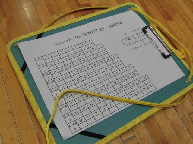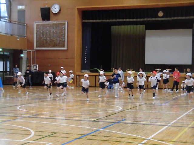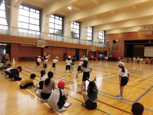 外では雨が降っていましたが、体育館では2年生と5年生がシャトルランに取り組みました。徐々に早くなるドレミの音に合わせて、20mを何度も往復します。5年生はグループになって2年生のサポートをしました。5年生の一人はペースメーカーとなって、2年生と一緒に走ります。スタートの合図がかかると、みな勢いよく走りだしました。初めは元気に走っていましたが、シャトルランでは持久力を測るのでだんだん遅れる子どもが出てきました。この種目をよく知っている5年生は、そんな2年生に素早く声を掛けて競技を終わらせたり、頑張っている子には励ましの声を送ったり、頼もしい姿を見せていました。