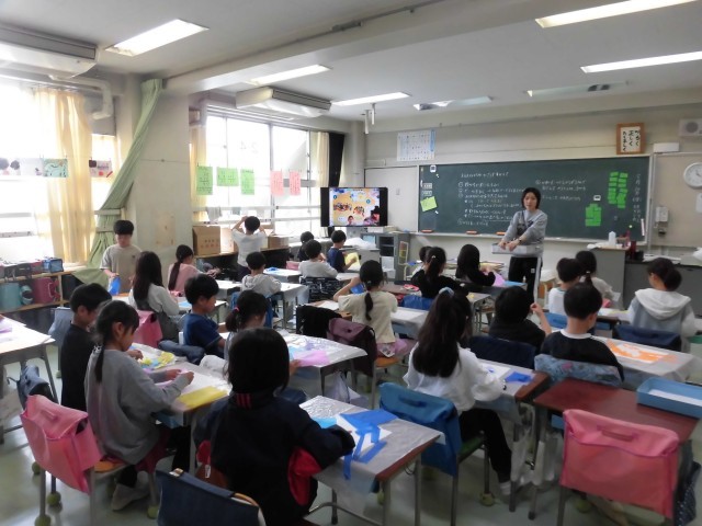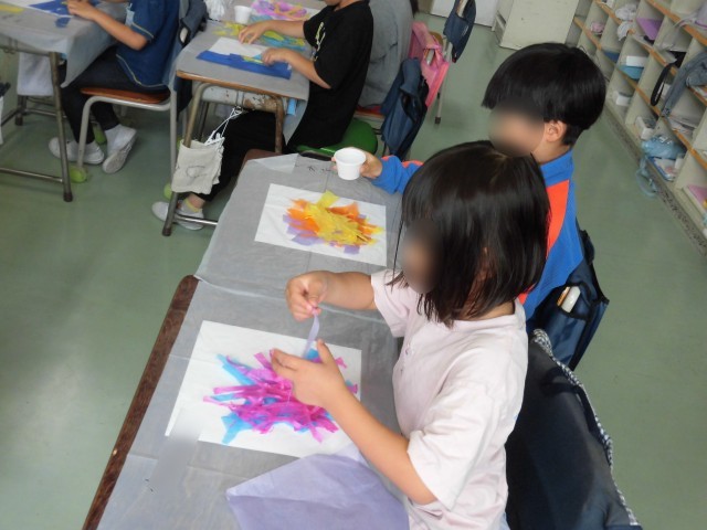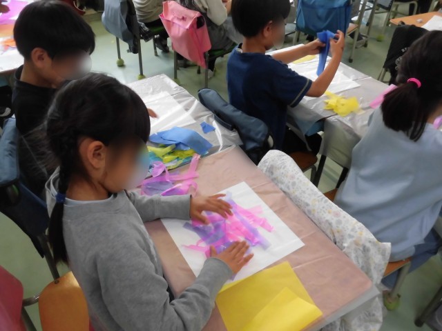 2年生の図工では「おはながみかざしてすかして」の制作をしています。好きな色のおはながみをちぎって、隙間なく並べたり重ねて好きな形・模様にします。その上にのりを少しずつたらし、透明なビニールで挟んでしっかりとおさえて乾かします。乾いたら、太陽に光に透かして見てみます。色鮮やかなおはながみが、どんな色できらきら輝くのでしょうか。楽しみです!