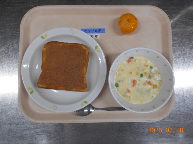 【献立】 牛乳 きな粉バタートースト 米粉のコーンシチュー くだもの(冷凍みかん)