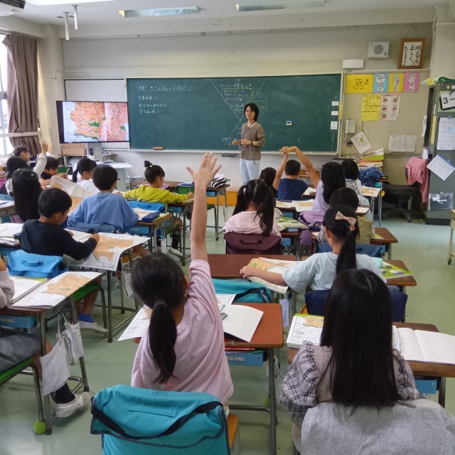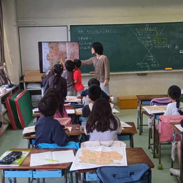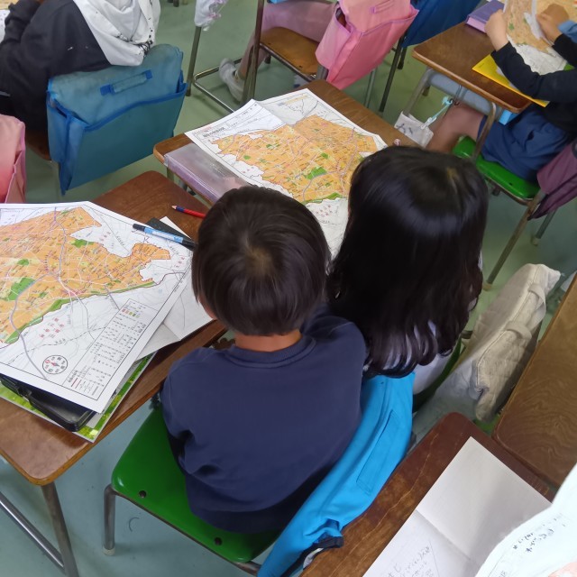 3年生は、町探検に向けて計画を立てるなど、事前学習をしています。社会科の学習として、世田谷区の地図を見ながら東西南北、土地の使われ方、交通の様子に注目し、明正小学校の周りを調べています。子どもたちは、発見したことを伝え合い、ノートにもよくまとめています。町探検本番では、自分たちの目でじっくりと確かめてほしいです。
