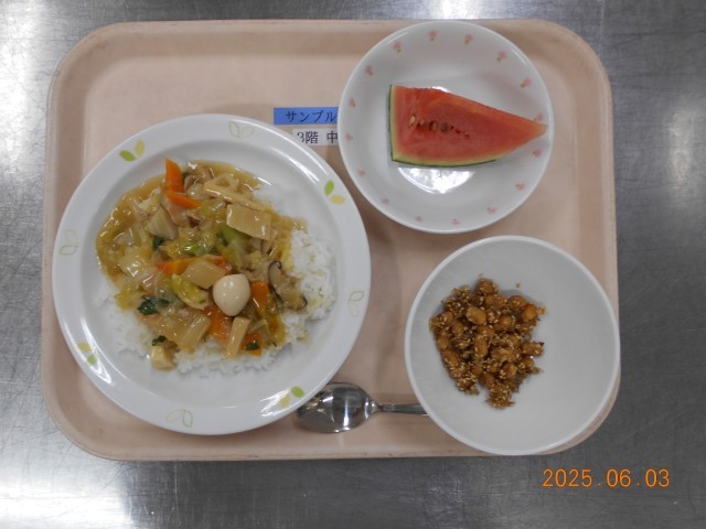 【献立】 牛乳 中華丼 大豆とじゃこの甘辛揚げ くだもの(すいか)